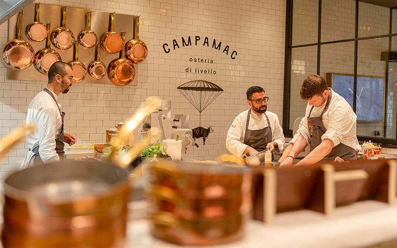 Campamac è un termine dialettale che significa “mettine ancora, dacci dentro”, ed è il motto che lo Chef Maurilio Garola usa per spronare la sua squadra in cucina, in particolare quando il livello di adrenalina sale.